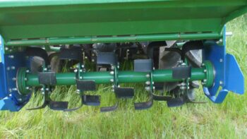 The well-designed Xeos series tiger rotary tiller is single speed gear drive implement and suitable for compact and sub-compact tractors from 15 to 40 HP. Widely applicable for soil preparation in Nurseries, Vineyards, Orchards, and Hobby Farms. Each flange has 6 heat-treated blades, fitted in a special arrangement that reduces the load on the tractor and gives fine finish performance. Standard attachment front safety guard, clutch PTO joint, and tool kit